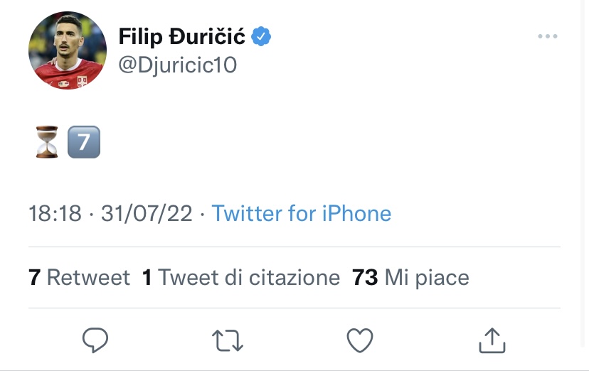 Nel corpo del testo molto breve infatti si vedono una clessidra e un numero, il 7, che accostato allo strumento per misurare il tempo crea una suggestione ben precisa. Presto Djuricic sarà legato al numero in qualche modo. E come potrebbe essere legato un calciatore ad un numero, se non indossandolo? Tra poche ore il serbo diventerà il numero 7 della Sampdoria e già i tifosi sui social impazziscono.