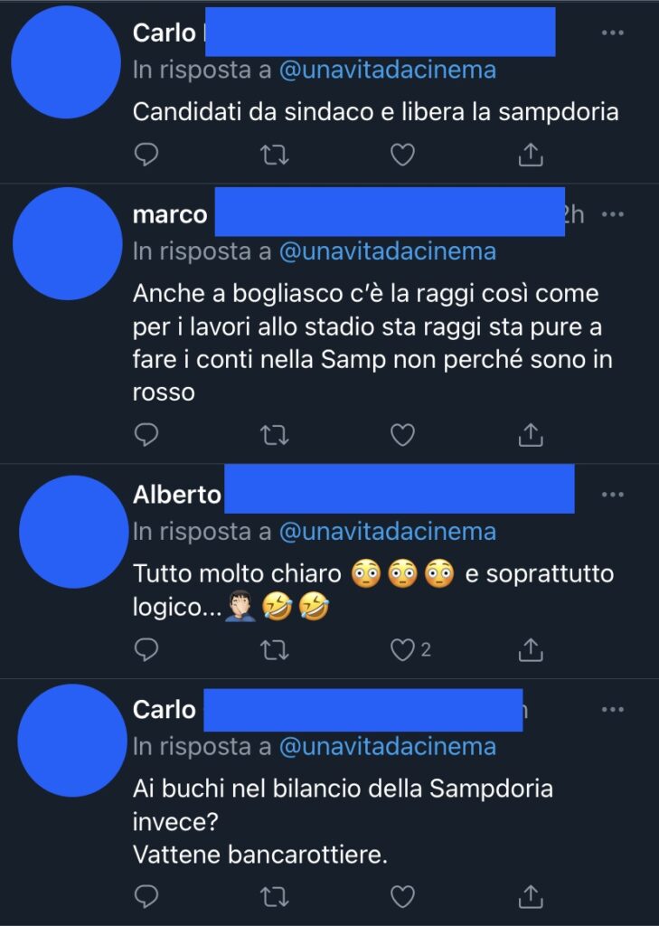 Sampdoriano è duro: “Pensa alle voragini di debiti che hai creato alla Sampdoria ed alle tue società che sono sull’ordlo del fallimento, fossi in te mi preccuperei più del tribunale di Roma, altro che delle buche…pagliaccio”