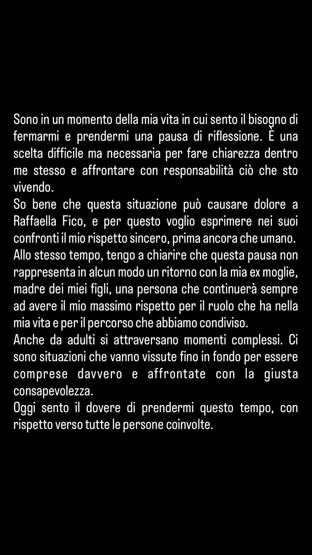 Nessuna conferma ufficiale è arrivata da Raffaella Fico, che mantiene il massimo riserbo, mentre Izzo ha scelto la via dei social per spiegare il proprio stato d’animo.
