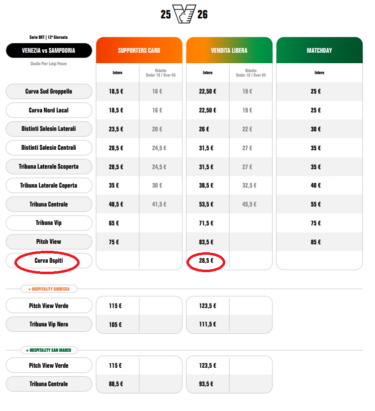 In vista della partita dello stadio Penzo il club lagunare ha diramato un comunicato ufficiale sull’acquisto dei biglietti, il prezzo per i tifosi della Sampdoria è di 28,5 euro. Ecco cosa scrivono nello specifico sul settore ospiti: