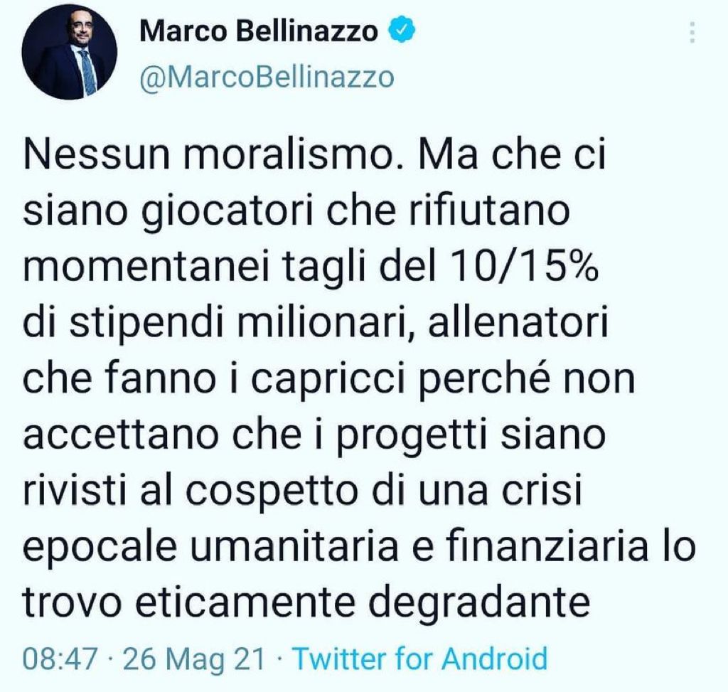 Nessun moralismo. Ma chi siano giocatori che rifiutano momentanei tagli del 10/15% di stipendi milioni, allenatori che fanno i capricci perchè non accettano che i progetti siano rivisti al cospetto di una crisi epocale umanitaria e finanziaria, lo trovo eticamente degradante.