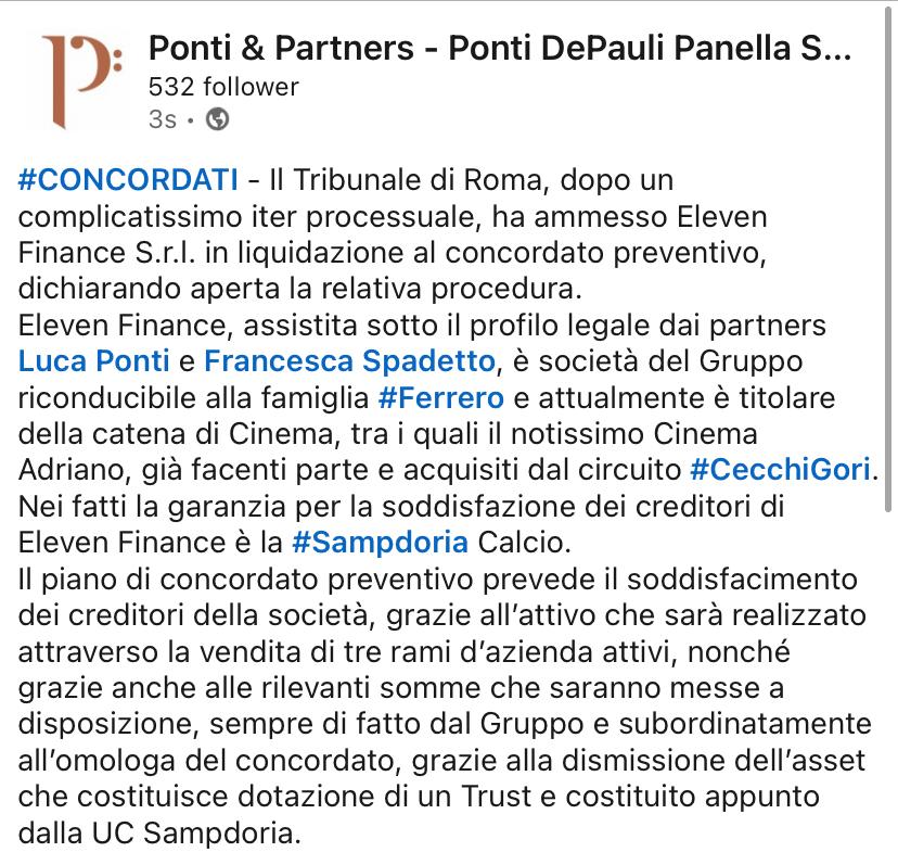 Luca Ponti: “Nel caso si addivenisse alla cessione anticipata della Sampdoria sarà nostra cura avvertire per iscritto il tribunale e riformulare la proposta di concordato e le relative garanzie alla luce delle nuove circostanze create dalla avvenuta cessione. Ci siamo sempre comportati con estrema correttezza nei confronti del tribunale, adottando criteri di comunicazione improntati alla assoluta correttezza. Continueremo a comportarci in questo modo”.