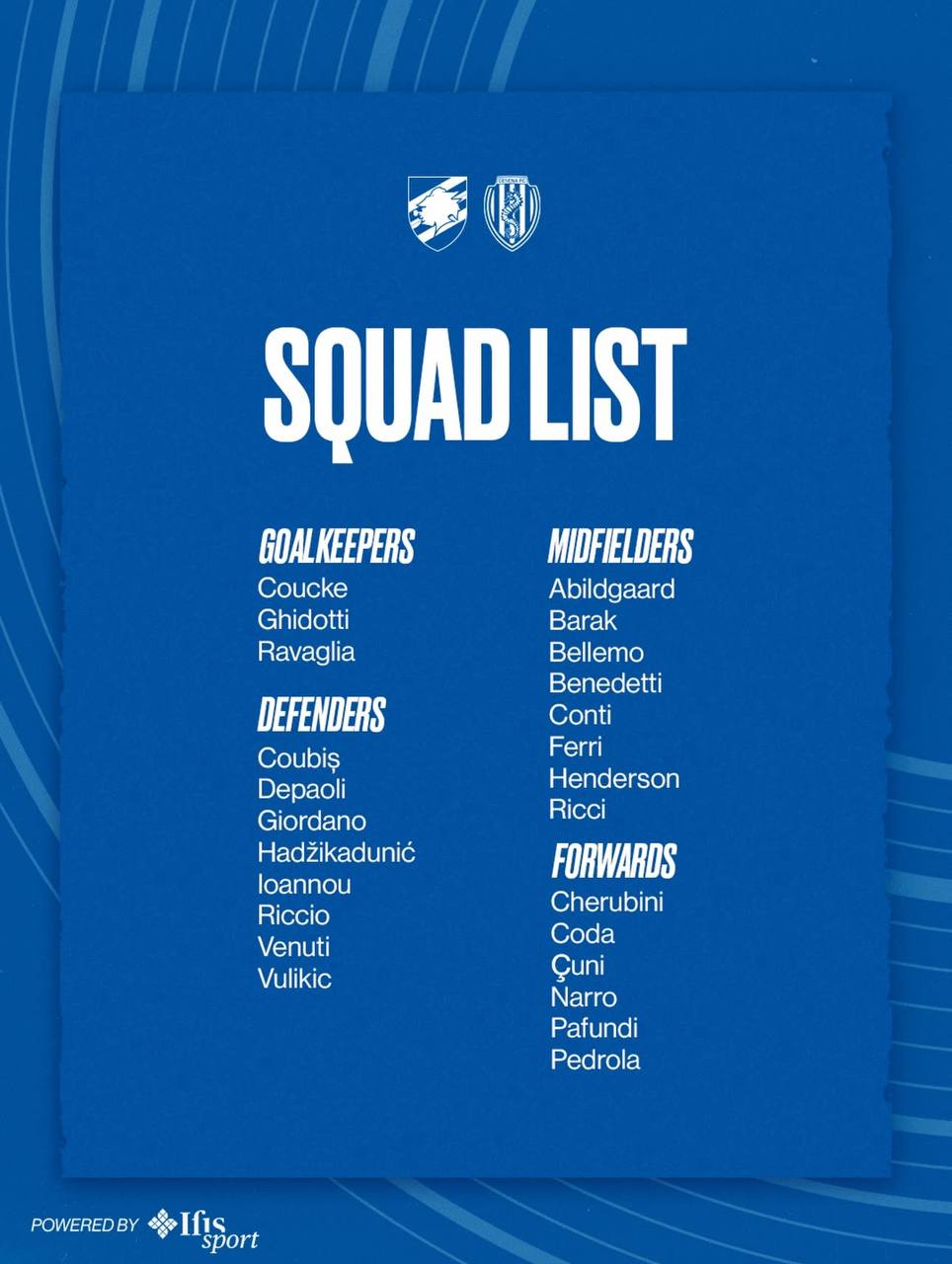 Al termine della seduta di risveglio, il tecnico Massimo Donati ha diramato l’elenco dei convocati per la sfida in programma questa sera al Luigi Ferraris. Di seguito la lista: