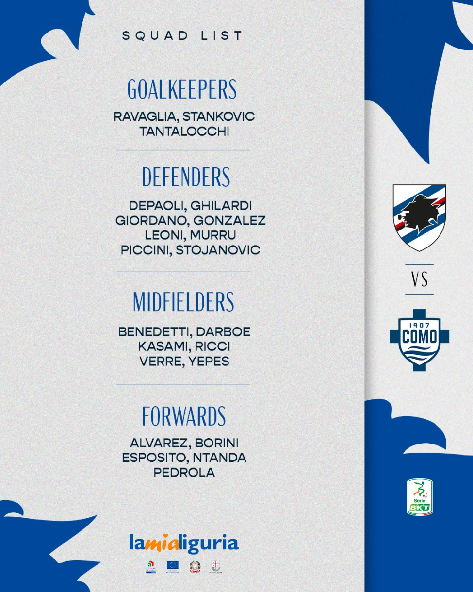 Ecco la lista dei convocati blucerchiati per la sfida tra la Sampdoria e il Como, Andrea Pirlo recupera Benedetti, non c’è invece Girelli.