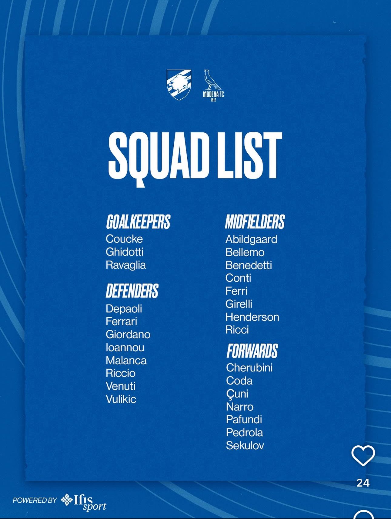 Attaccanti: Cherubini, Coda, Çuni, Narro, Pafundi, Pedrola, Sekulov