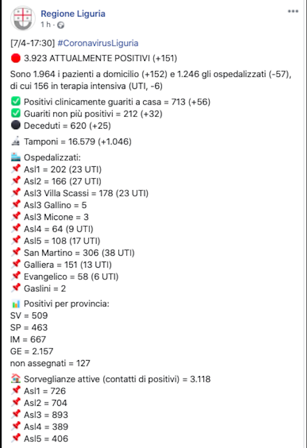 Di seguito il bollettino integrale rilasciato dalla Regione Liguria
