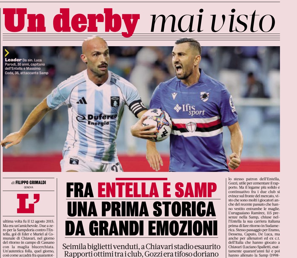 Sarà una prima volta storia tra Entella e Sampdoria venerdì 17 ottobre. Il primo scontro in gare ufficiali tra le due squadre che l’ultima volta si sono affrontate, in amichevole, il 12 agosto 2015. Era la Sampdoria di Eder e Muriel a Chiavari, nel giorno del ritorno in blucerchiato di Antonio Cassano. Finì 2-0 proprio con i goal di Eder e Muriel.