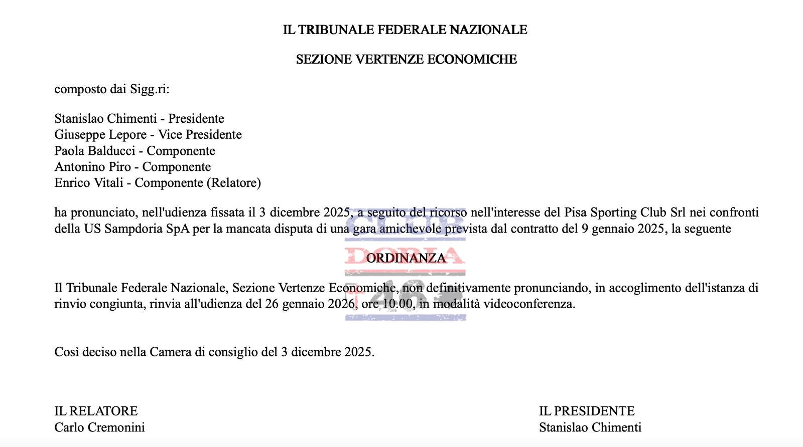 Ricorso nei confronti della Sampdoria e nell’interesse del Pisa al Tribunale Federale Nazionale, nella sezione Vertenze economiche. Al centro un’amichevole non disputata