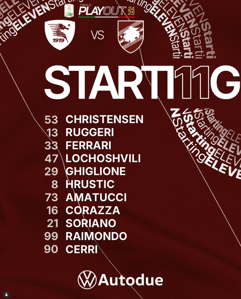 Salernitana (3-4-1-2), Christensen; Ruggeri, G. Ferrari, Lochoshvili; Ghiglione, Amatucci, Hrustic, Corazza; Soriano, Raimondo; Cerri. A disposizione: Sepe, Gentile, Tongya, Simy, Bronn, Njoh, Reine-Adelaide, Guasone, Verde, Jaroszynski, Tello, Girelli. Allenatore: Pasquale Marino