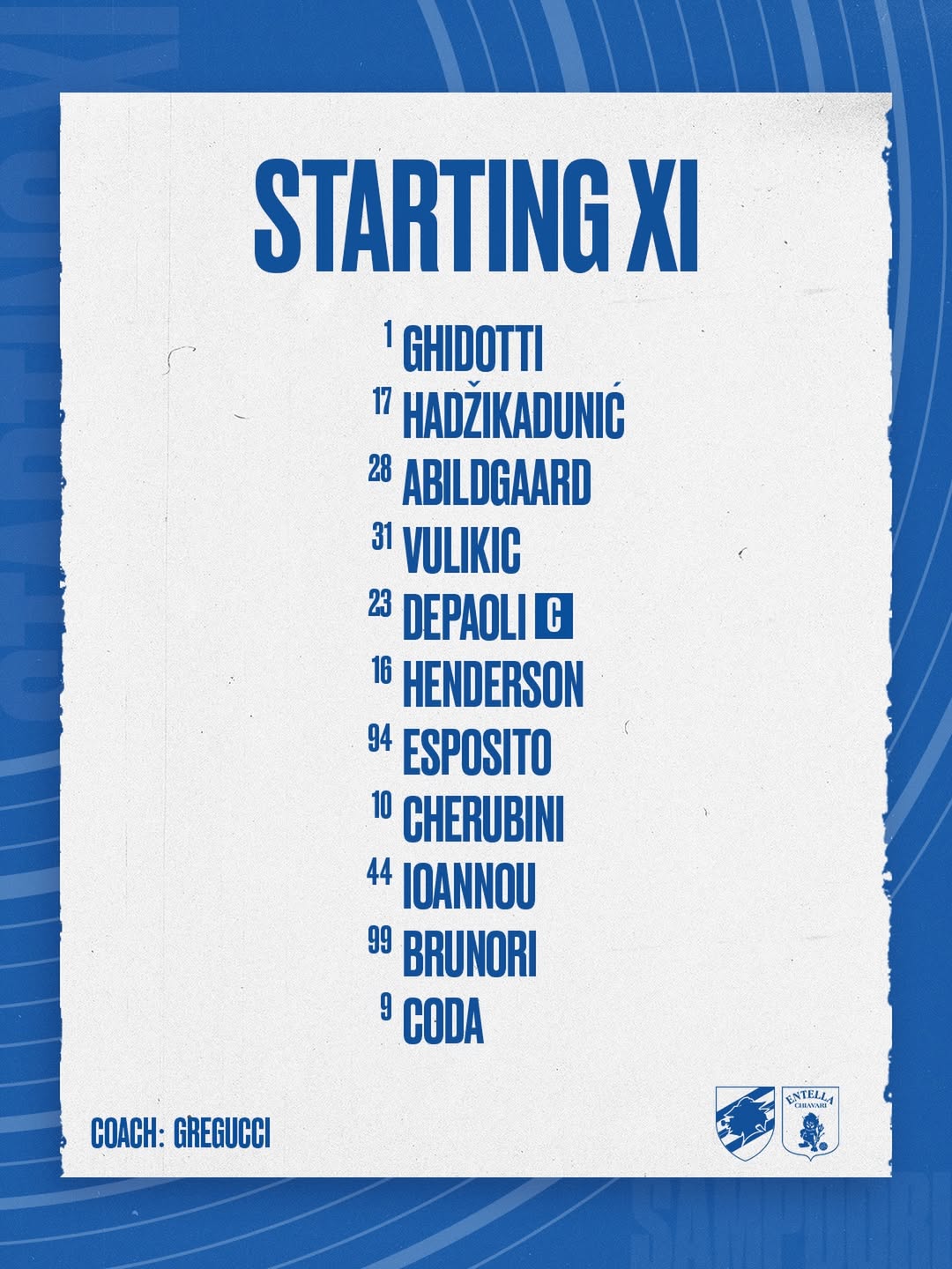 Sampdoria (3-5-2), Ghidotti, Hadzikadunic, Abildgaard, Vulikic, Depaoli, Esposito, Henderson, Cherubini, Ioannou, Brunori, Coda. A disposizione: Ravaglia, Martinelli, Palma, Ferrari, Giordano, Bellemo, Benedetti, Barak, Conti, Pafundi, Begic, Cuni,