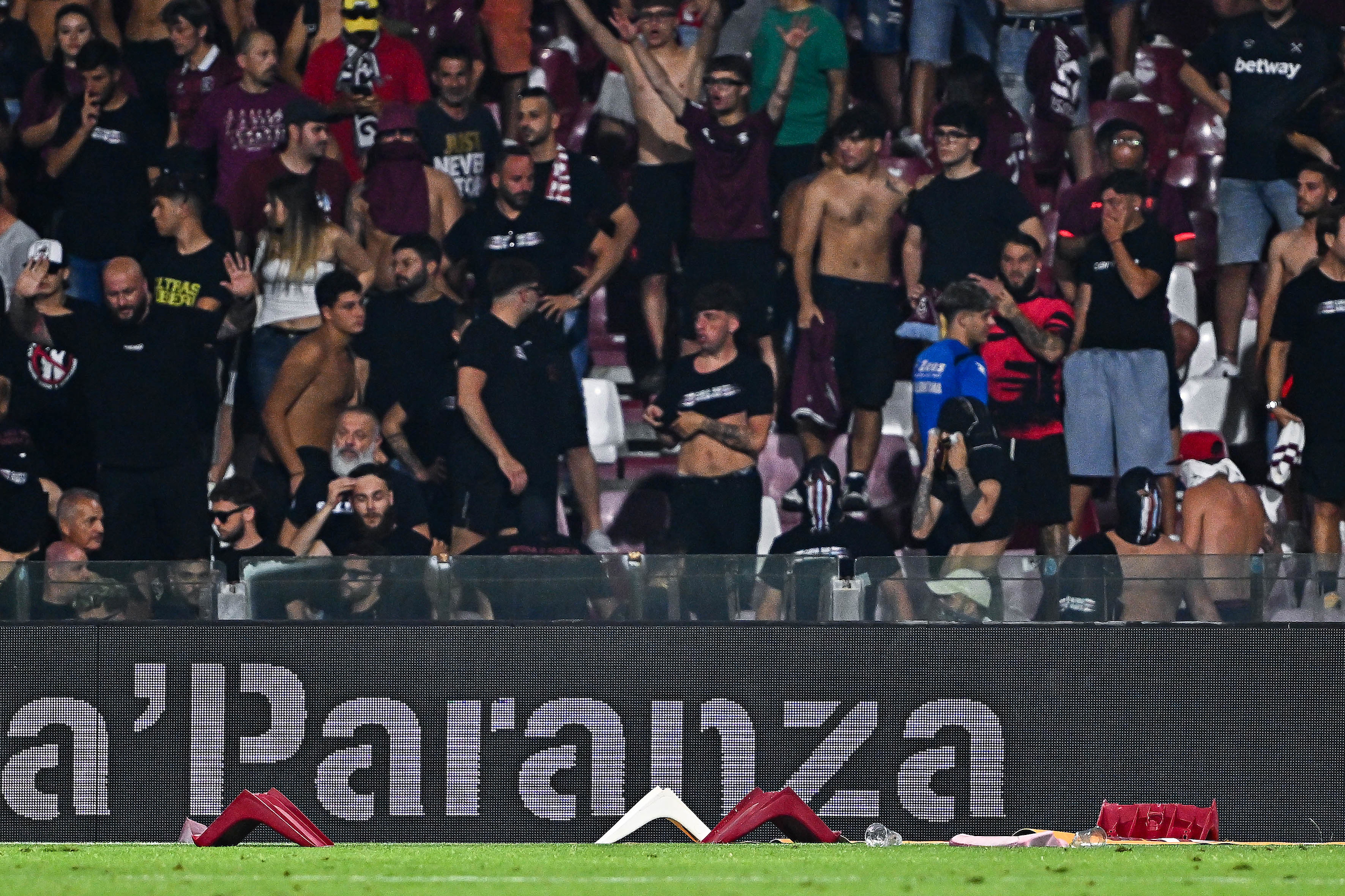 La partita tra Salernitana di Pasquale Marino e la Sampdoria di Alberico Evani, gara valevole per il ritorno dei playout di Serie Bkt è stata sospesa al minuto 20 del secondo tempo per lancio di fumogeni e seggiolini all’interno del terreno di gioco da parte dei supporters granata. Una protesta che già si poteva aspettare da tempo, l’avevano mezza annunciata e visto anche il risultato che stava condannando i granata si è trasformata in realtà.