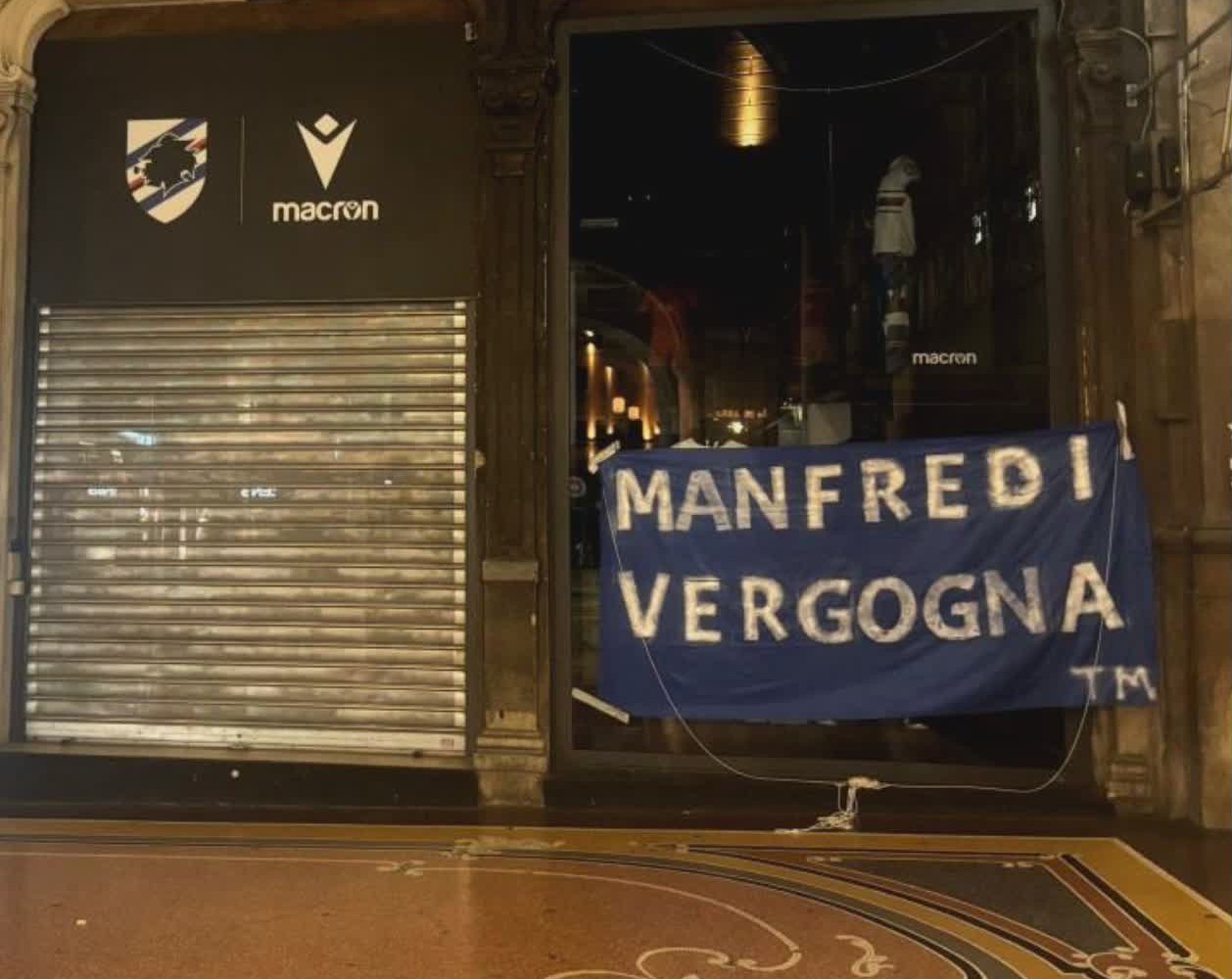 Nel frattempo alcuni tifosi nella notte hanno appeso uno striscione contro il presidente della Sampdoria Matteo Manfredi, a dimostrazione che il clima di contestazione non accenna a diminuire. Davanti alla vetrina del Point blucerchiato di via XX settembre a Genova è stato affisso uno striscione con scritto: “Manfredi vergogna“.