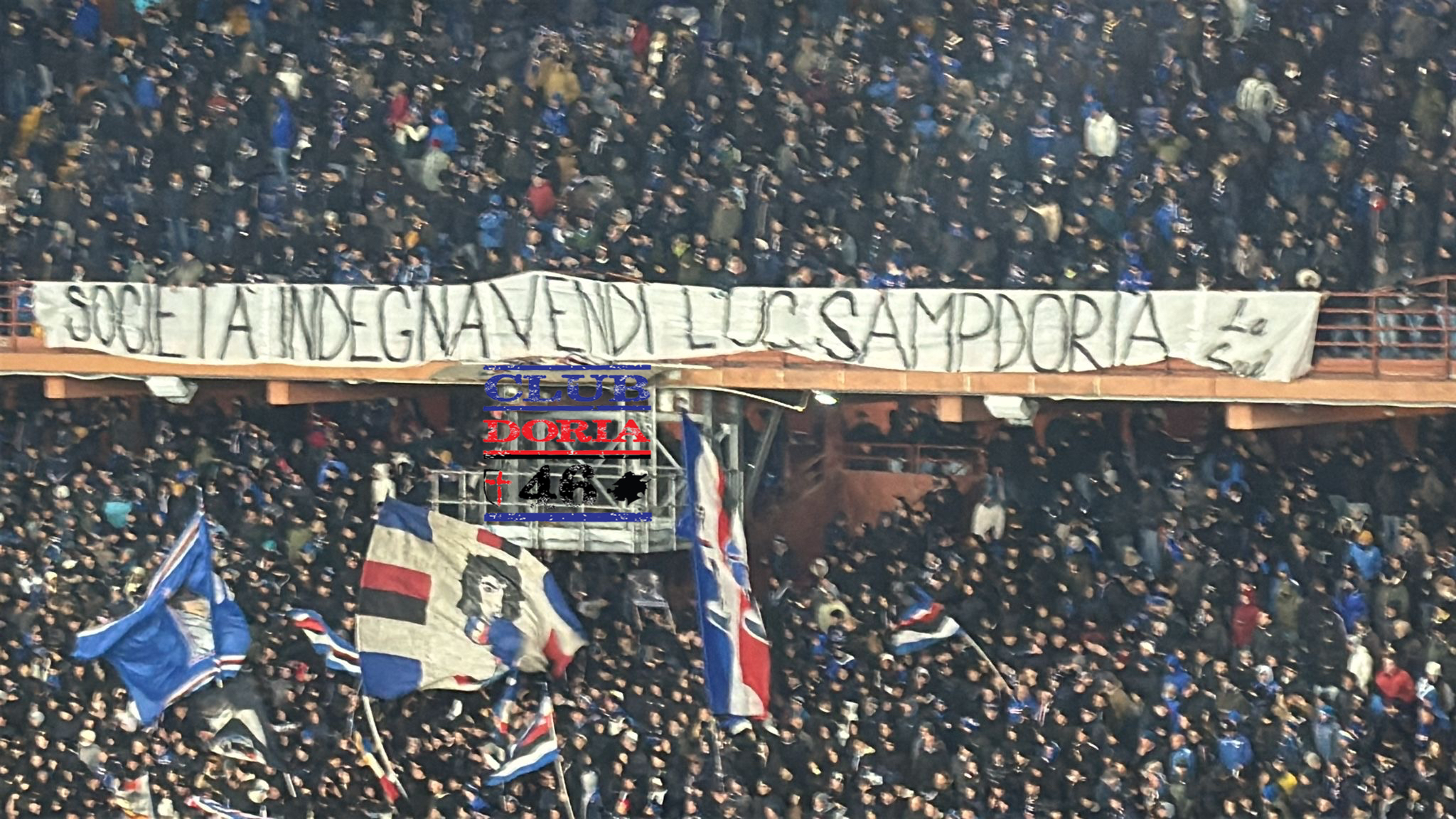 Tutt’altro invece nei confronti dei membri della società, a cui i sampdoriani continuano a rivolgere lo stesso messaggio. Che è stato ribadito da un altro striscione, apparso nel secondo tempo dalla parte superiore della Gradinata. Questa volta in italiano: “Società indegna, vendi l’Uc Sampdoria“