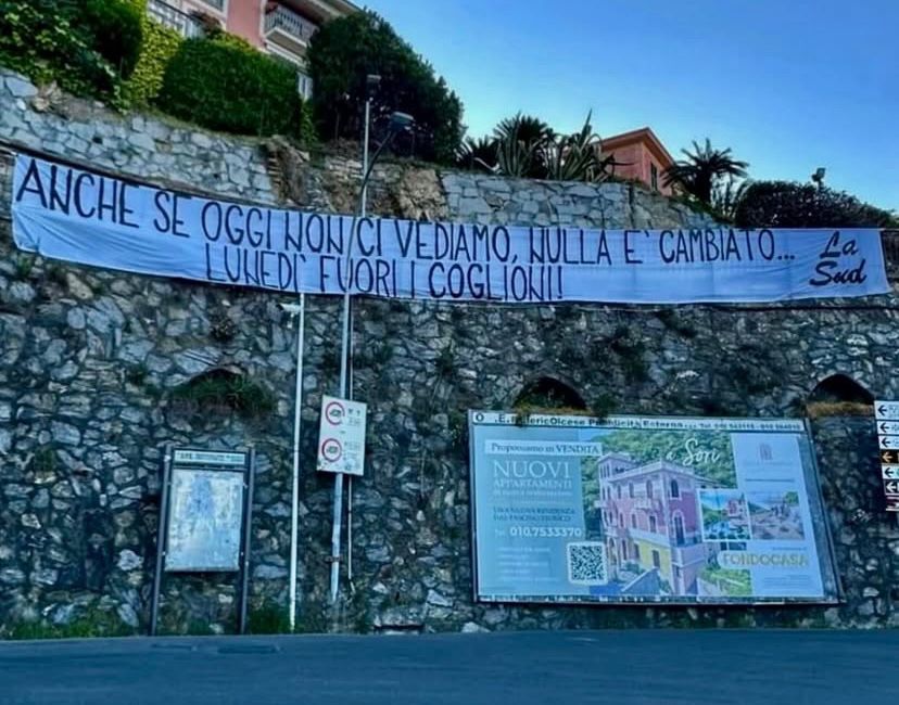Nella prima curva della salita per arrivare al centro sportivo “Gloriano Mugnaini” a Bogliasco, infatti, in mattinata è apparso uno striscione poi diventato virale sui social, sui cui si legge che “Anche se oggi non ci vediamo, nulla è cambiato…lunedì fuori i c…“.