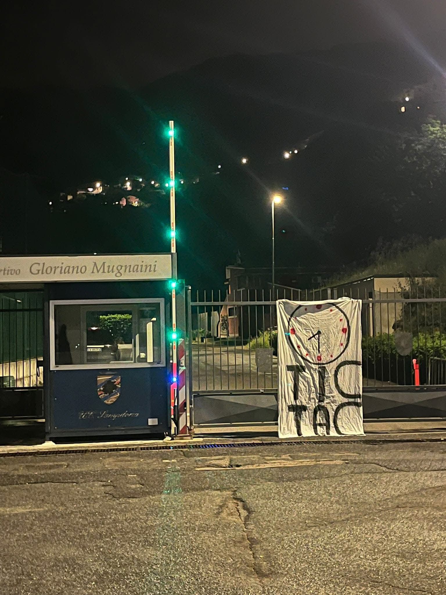 La Sampdoria si gioca la retrocessione in Serie C, nella notte a Bogliasco striscione dei genoani appeso ai cancelli: "Tic Tac"
