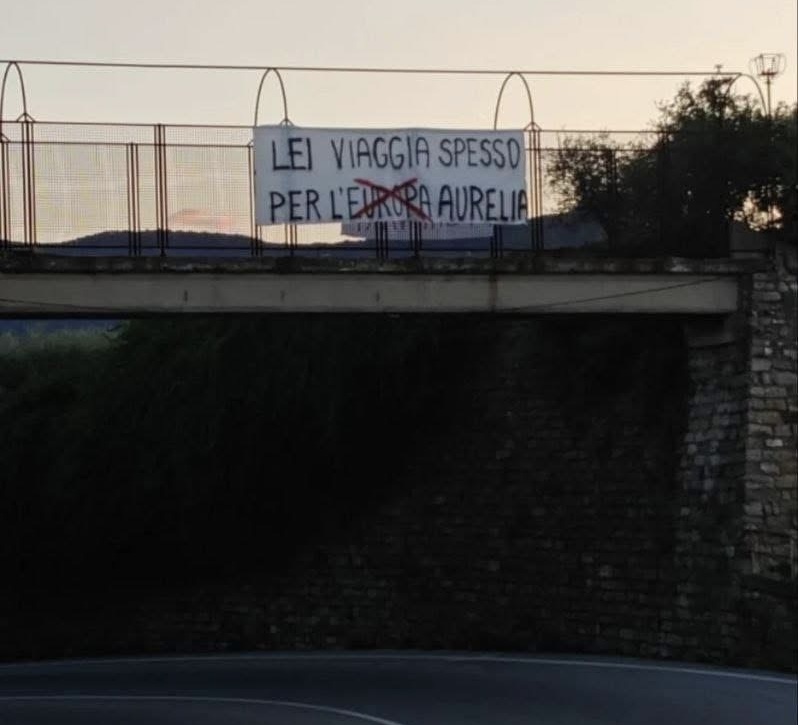 Ma è il secondo striscione ad essere il più creativo, perché storpia la canzone d’amore dei sampdoriani, “Lettera da Amsterdam“ dei fratelli De Scalzi, facendola diventare uno sfottò. Da “Lei viaggia spesso per l’Europa” gli ignoti hanno cancellato l’ultima parola, sostituendola con “L’Aurelia“, in riferimento alla strada statale che collega la Liguria e quindi Genova a Chiavari.