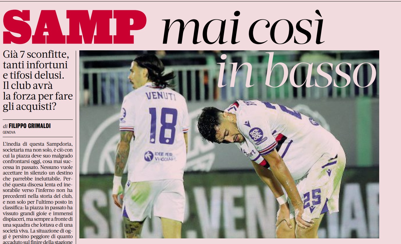 La Gazzetta dello Sport ha analizzato con toni molto duri la situazione della Sampdoria. Il destino sempre “ineluttabile”, una lenta discesa verso “l’inferno che non ha precedenti nella storia del club”. Con una situazione che viene definita anche peggiore di quella del finale della scorsa stagione, quando la salvezza arrivò solo tramite il playout contro la Salernitana.