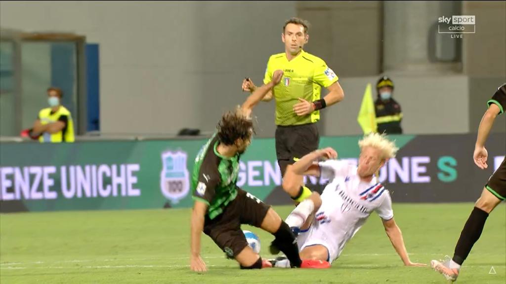 Primo “episodio” chiave al 34’: Thorsby prova ad aggiustarsi un pallone in area di rigore neroverde, da dietro Chiriches aggancia il norvegese quando si era già liberato del pallone. Lascia giocare Sacchi e (forse anche per l’eccesso di correttezza di Thorsby e di tutti i blucerchiati che non accennano neppure ad una minima protesta) nessuna chiamata di review neppure da parte del VAR Maresca.