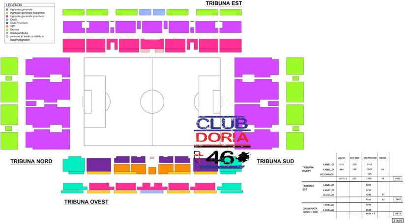 Nella nuova divisione La Sud sarà di 8.408 posti – come la Gradinata Nord – mentre la Tribuna Ovest, due anelli e il ristorante, avrà 6.938 posti. I restanti 7.847 saranno in Tribuna Est, divisa su tre anelli. Sempre in Tribuna Ovest ci saranno i posti dedicati agli ospiti: 1.597.