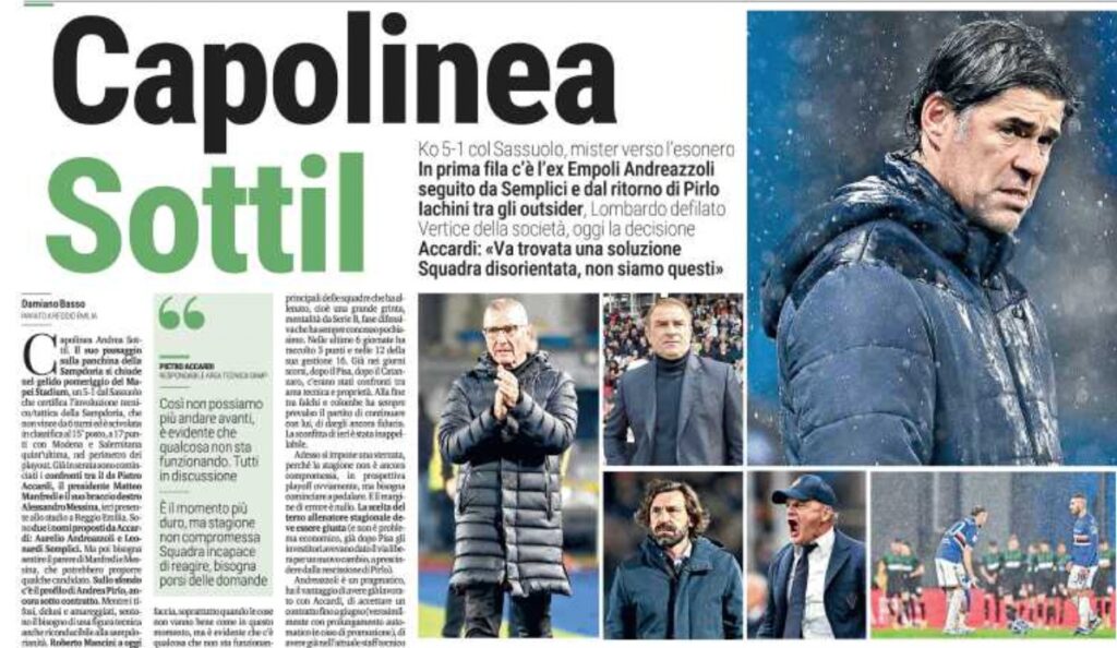 Fine della corsa. Capolinea Andrea Sottil scrive Il Secolo XIX e non potrebbe essere altrimenti dopo il 5-1 subito in casa del Sassuolo. Una sconfitta umiliante per la Sampdoria, che, dopo 16 giornate, si trova pericolosamente al 15° posto a solo 17 punti e con appena una lunghezza di vantaggio sulla retrocessione
