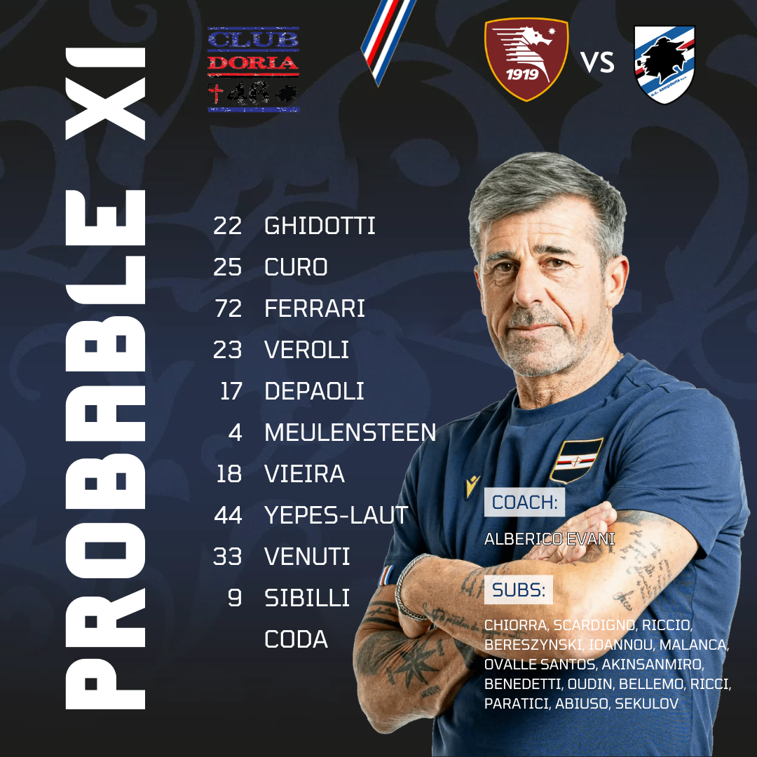 Questa la probabile formazione blucerchiata per la sfida tra Salernitana e Sampdoria, Alberico Evani cambia solo in difesa.