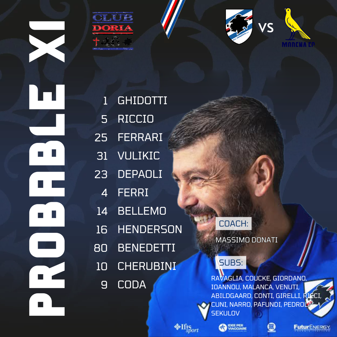 La probabile formazione blucerchiata per Sampdoria-Modena, Massimo Donati sceglie subito Luigi Cherubini, panchina per Abildgaard e Pafundi