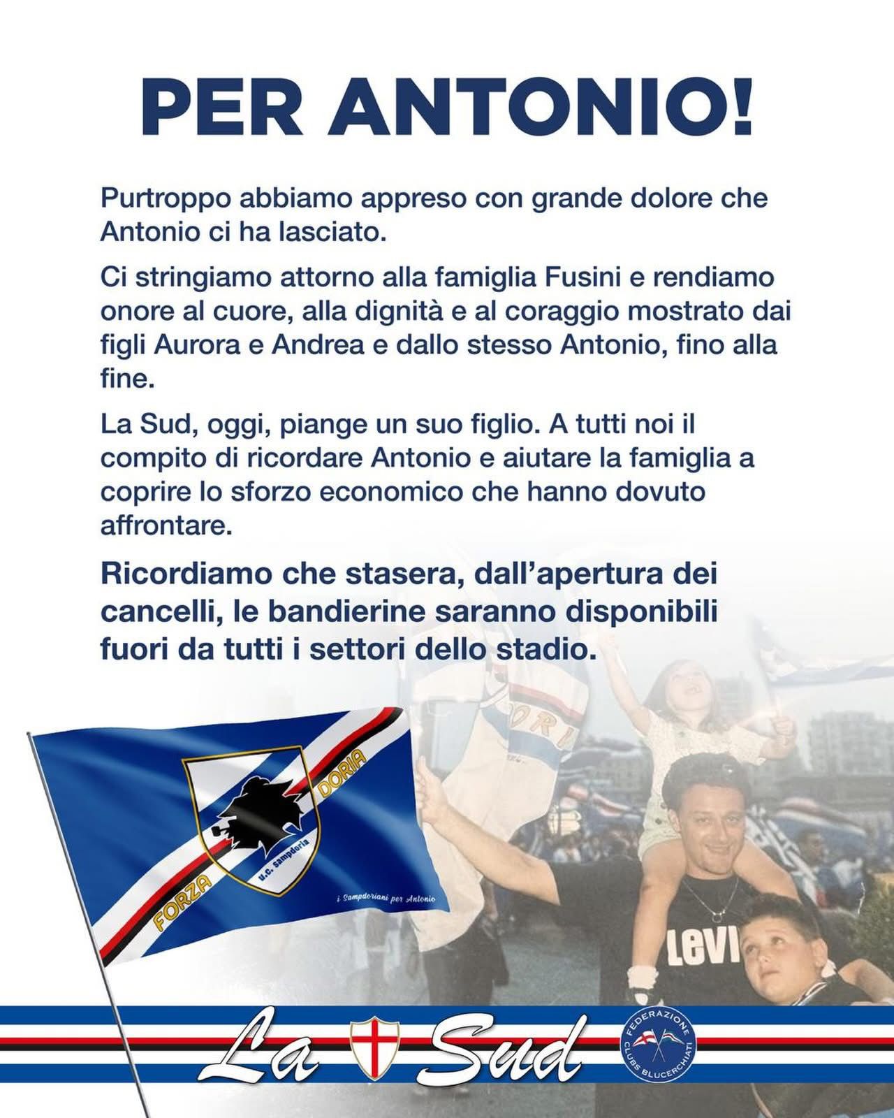 La Sud ha lanciato un appello: aiutare la famiglia di Antonio Fusini, un grande tifoso blucerchiato. Il cuore dei sostenitori blucerchiati si stringe introno alla famiglia e vorrà rendere onore alla grande dignità mostrata dai figli, Aurora e Andrea.