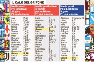 Come nel caso del Genoa, che, passando dai due punti a partita delle cinque partite pre-lockdown, agli appena 0,4 del post, si sta giocando la Serie A. Una media punti che sta costando al grifone, ora terzultimo a un punto dal Lecce e a cinque dalla Sampdoria, la salvezza.