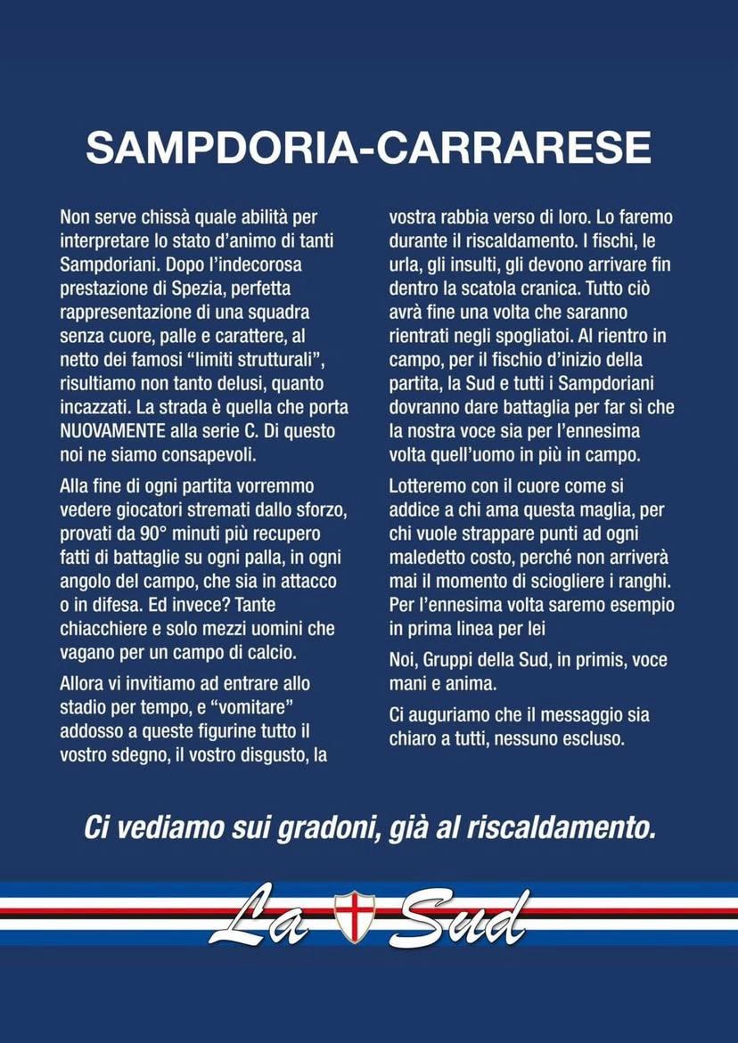 La Sud chiama a raccolta tutti i tifosi per fischiare la squadra nel riscaldamento di Sampdoria-Carrarese, poi durante i 90 minuti ci sarà il solito sostegno immancabile