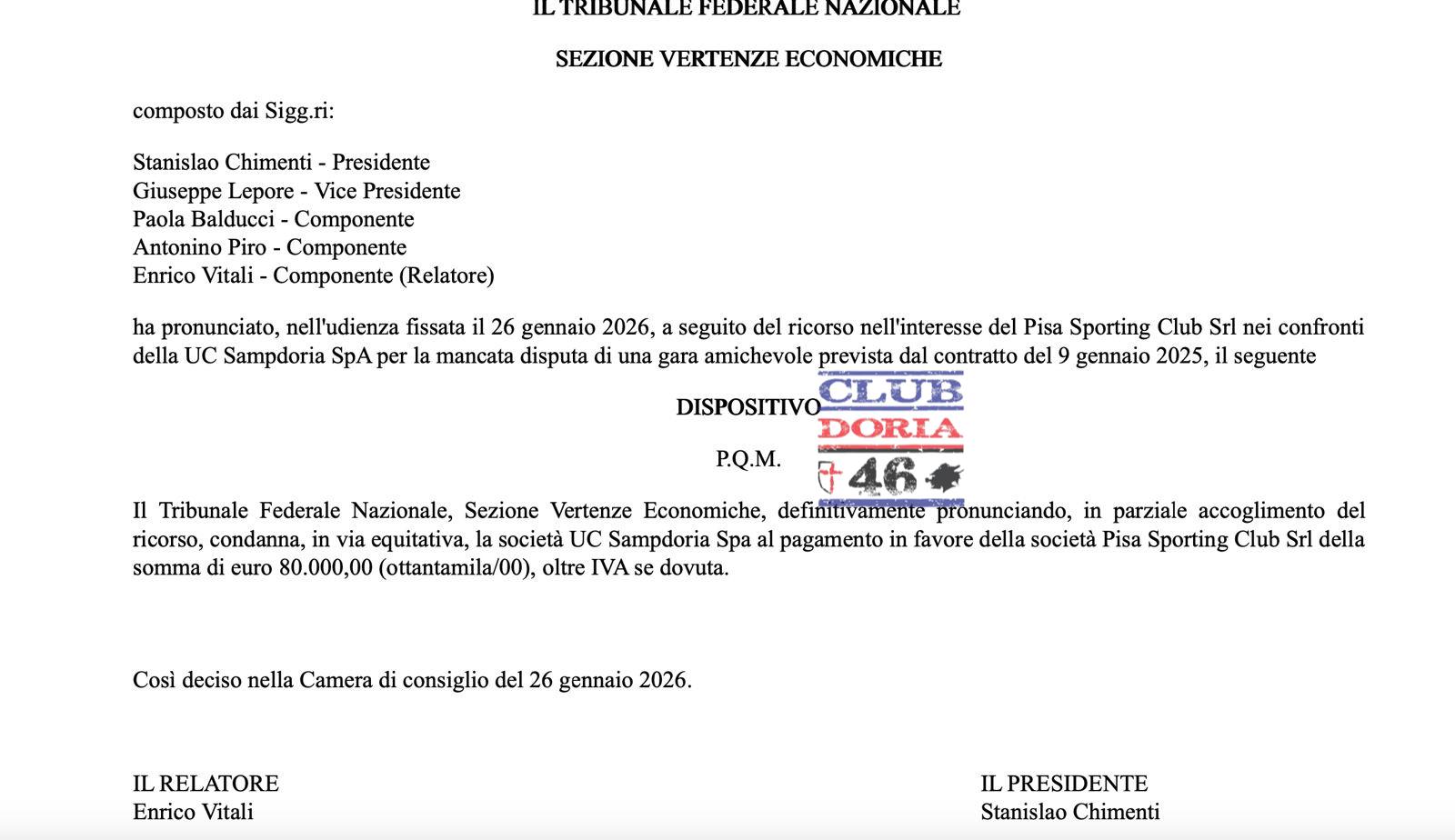 Tutto parte dal 9 gennaio 2025, quando le due società avevan previsto un’amichevole nell’ambito del trasferimento di Pietro Beruatto dai nerazzurri ai blucerchiati, effettivamente formalizzato il giorno successivo, 10 gennaio. Quella partita non si è mai disputata, nonostante fosse prevista da contratto. E dunque il Pisa ha deciso di presentare ricorso al TFN, che inizialmente aveva previsto la sentenza a inizio dicembre. Poi però aveva rinviato tutto al 26 gennaio 2026, giorno in cui la sezione vertenze economiche si è effettivamente pronunciata.