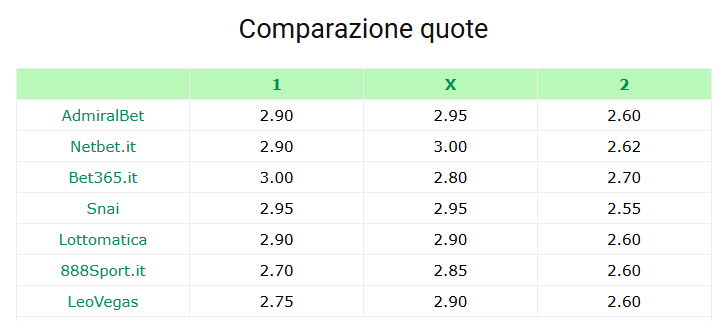 Il pareggio si mantiene su valori molto vicini, compresi tra 2.80 (Bet365) e 3.00 (Netbet), passando per 2.85 di 888Sport e 2.90-2.95 degli altri operatori.