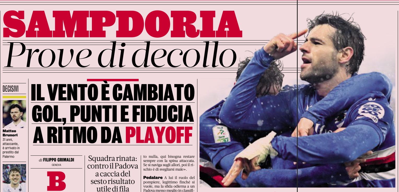 “Prove di decollo” scrive La Gazzetta dello Sport. Il vento – si legge – è cambiato e la Sampdoria che scenderà in campo contro il Padova alle 15 è una squadra in fiducia che, inoltre, viene da 14 punti nelle ultime 6 partite al Luigi Ferraris, una serie positiva che dura ormai dal 24 novembre.