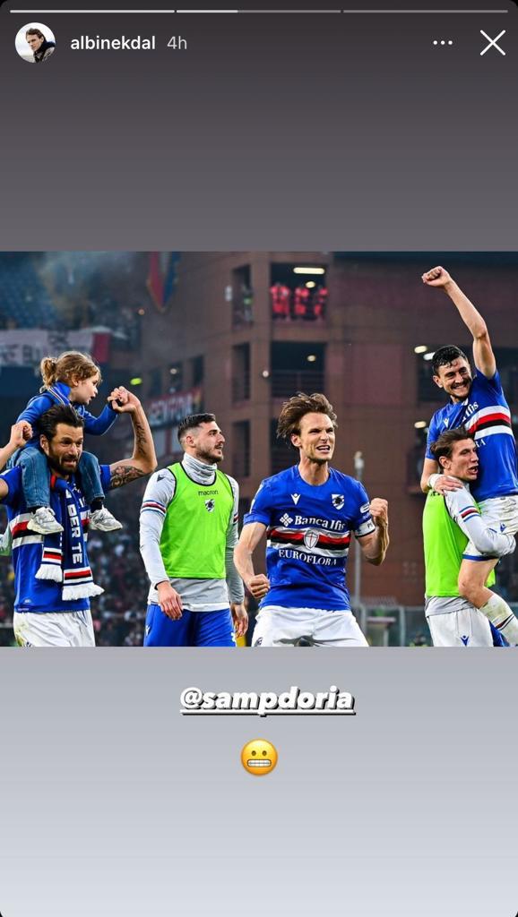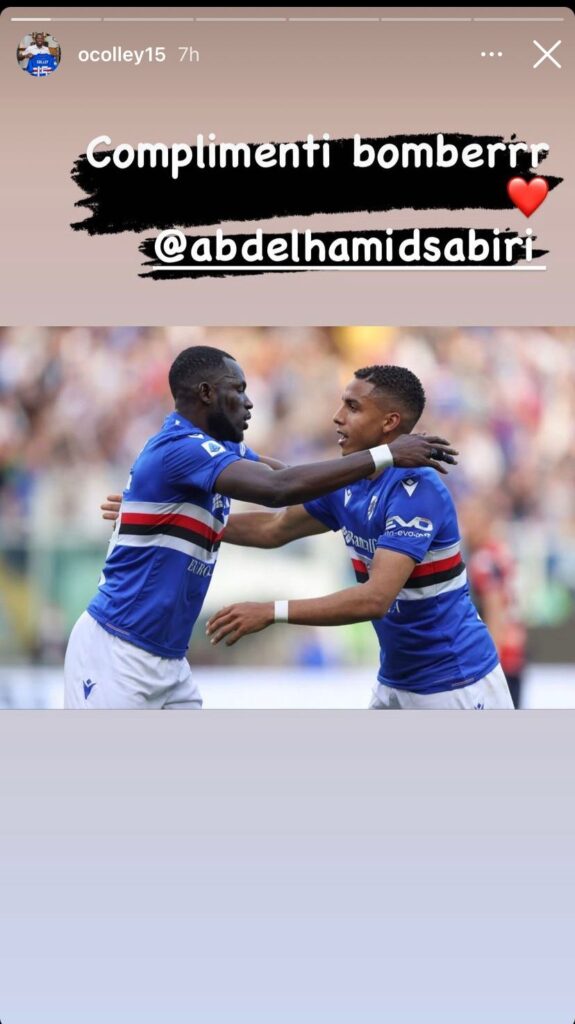Foto dei festeggiamenti anche per Albin Ekdal, autore di una prova magistrale contro i rossoblù, e con Sabiri. Colley invece pubblica un’istantanea subito dopo il rigore parato da Audero e poi un’altra sempre con il numero 11 blucerchiato.