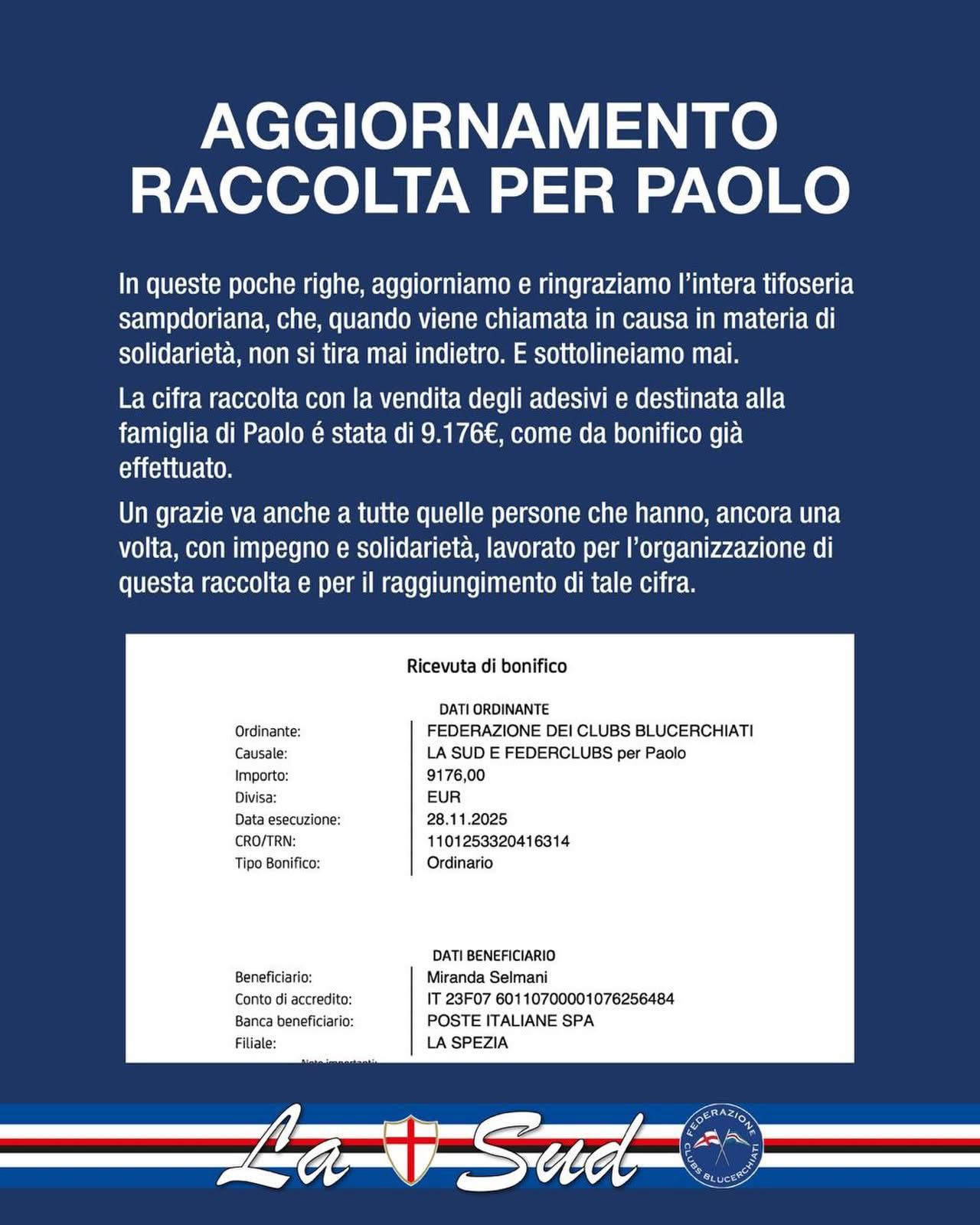 Sampdoria, il cuore de La Sud tutto per Paolo. La cifra raccolta