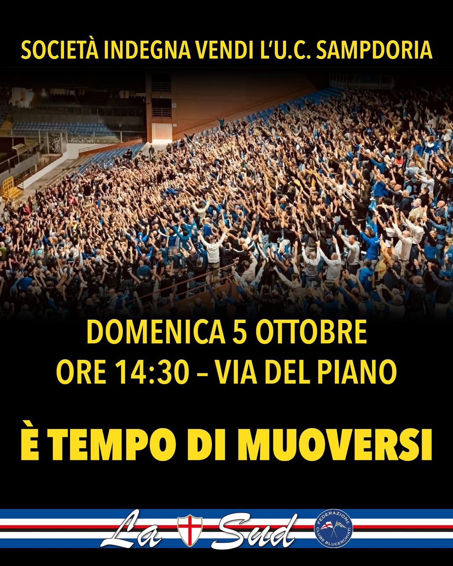 Sarà una giornata calda quella di domenica 5 ottobre per i tifosi della Sampdoria. La Sud si è data appuntamento in Via Del Piano per poi partire in marcia verso l’ingresso delle tribune. Nel mirino dei tifosi della formazione blucerchiata c’è un solo obiettivo: contestare la società, definita indegna da tutti i suoi sostenitori.