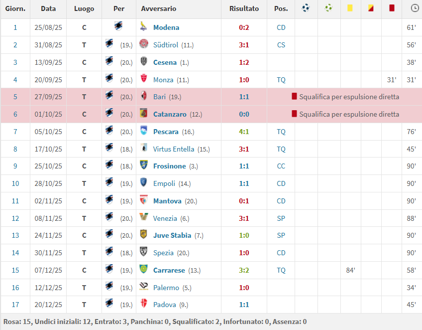 Sampdoria, Luigi Cherubini: più cartellini rossi che goal. La stagione