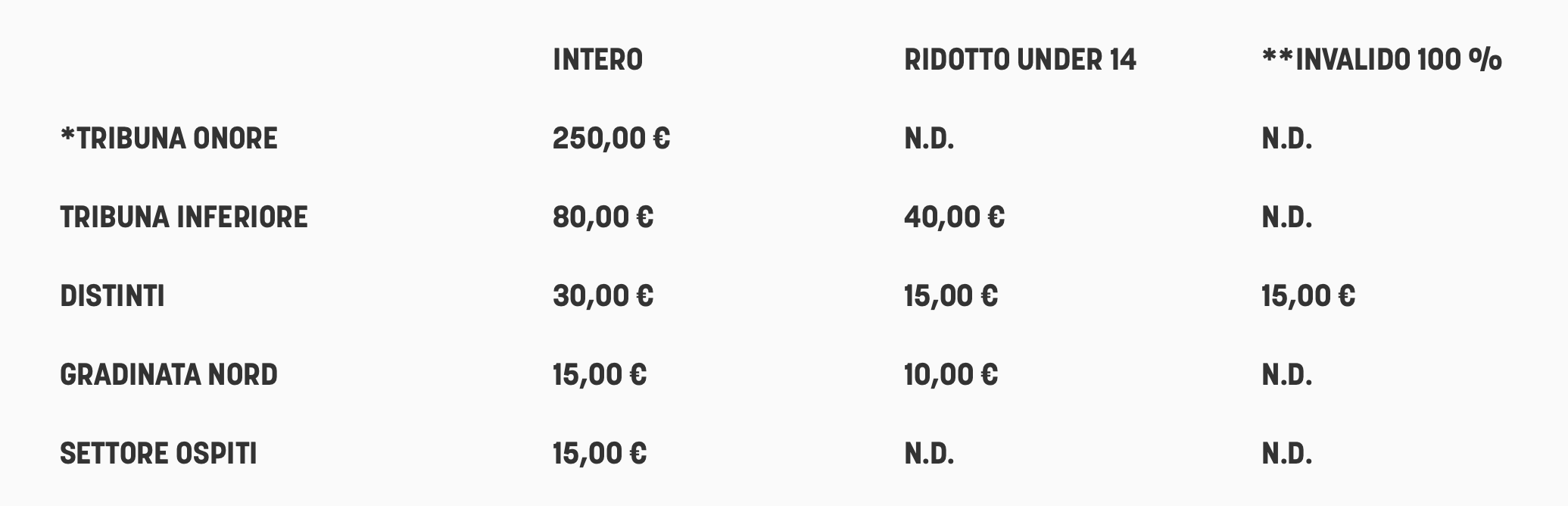 Alle 11 è partita la vendita dei biglietti per assistere alla sfida in programma domenica 2 novembre alle 19:30. I biglietti potranno essere acquistati online sul sito Ticketone oppure nei rivenditori autorizzati dal circuito sparsi sul territorio. Vendita attiva anche a SampCity e, nel giorno della partita, anche nei botteghini stadio di via Monnet. Di seguito i prezzi dei biglietti.