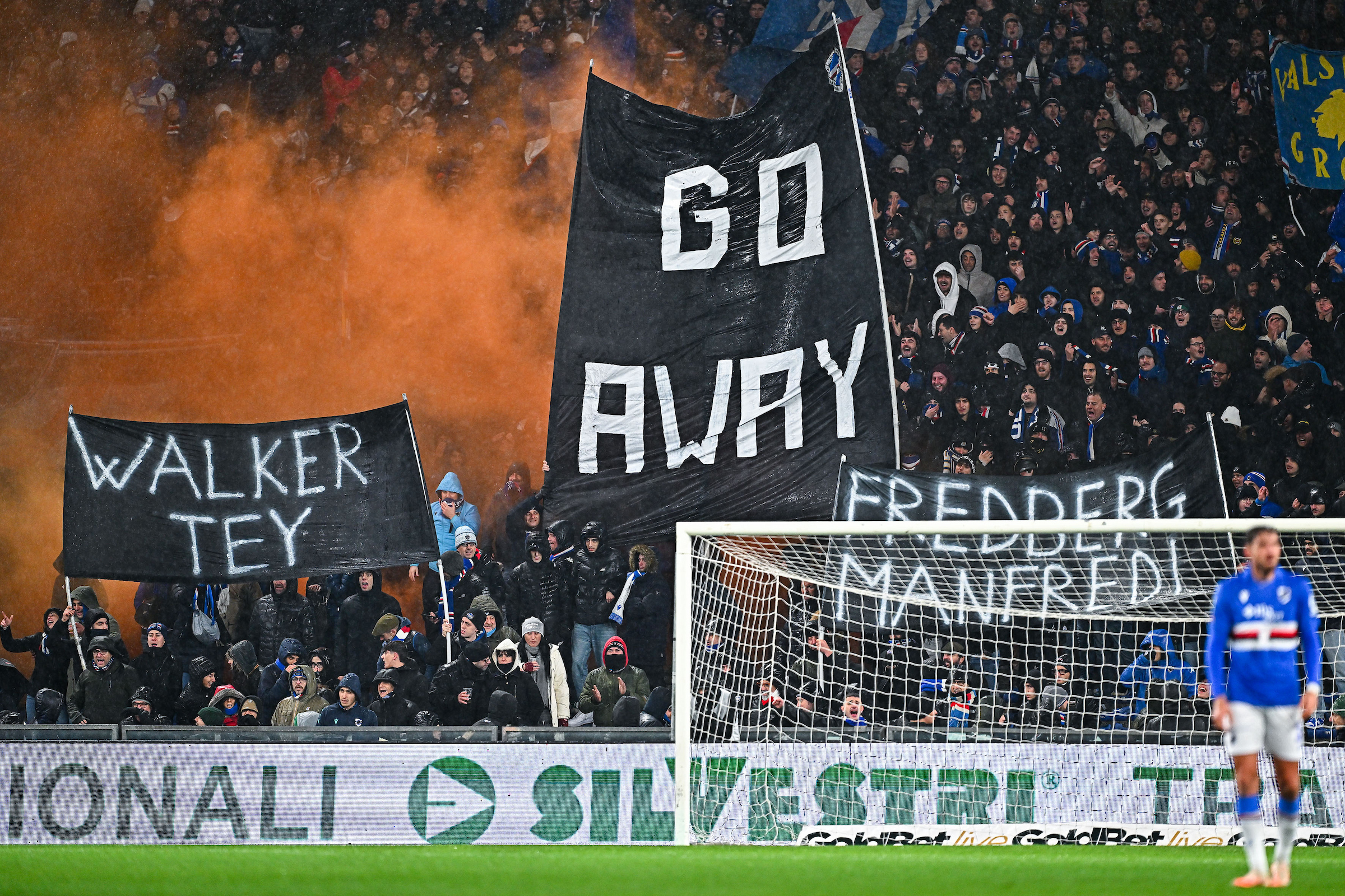 Tifosi Sampdoria – Striscioni contro Nathan Walker (rappresentante azionisti Sampdoria)-Joseph Tey Wei Jin (azionista Sampdoria)-Jesper Fredberg (c.e.o. Area Football Sampdoria)-Matteo Manfredi (presidente Sampdoria)