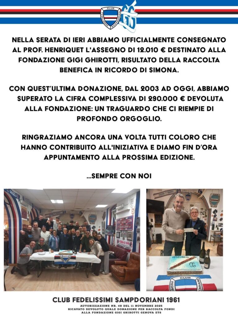 Il Club Fedelissimi ha informato che nella serata di martedì 17 febbraio ha consegnato il ricavato della raccolta benefica al professor Henriquet, in rappresentanza della sua associazione che offre cure ai malati che hanno maggiore bisogno di assistenza. In totale, da quando l’iniziativa è partita nel 2003, il gruppo di tifosi della Sampdoria è riuscito a raccogliere 290mila euro da devolvere alla Gigi Ghirotti.