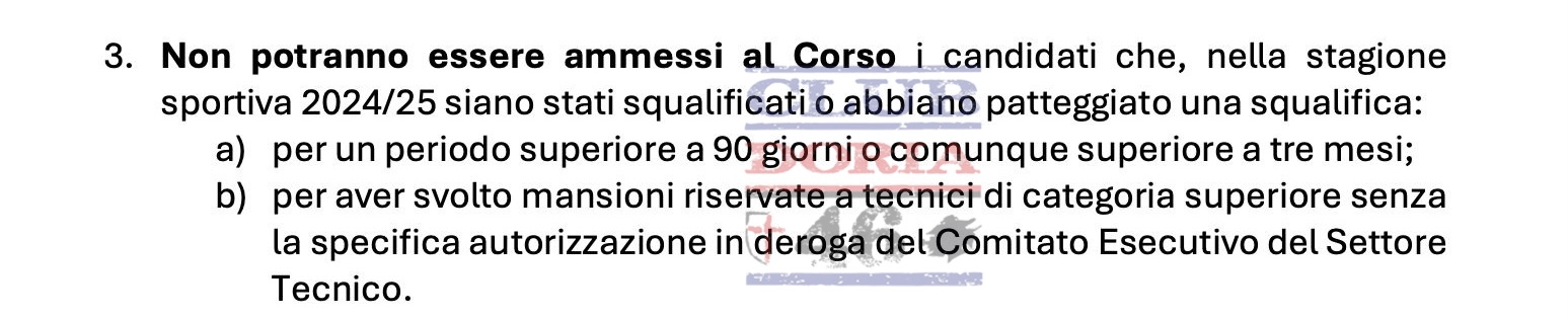 Prendendo il bando pubblicato per la stagione 2024/25 sul sito della Figc si legge che, tra i requisiti, serve non avere ricevuto squalifiche nel campionato precedente per un periodo superiore a 90 giorni o tre mesi. E Foti ha già scontato tre giornate di stop durante l’incarico alla Sampdoria quando è stato espulso dalla panchina, a cui deve aggiungere le 10 che ha ricevuto poche or fa. Ma ciò che potrebbe preoccupare maggiormente l’ex tecnico blucerchiato è la voce 3.b del bando. Ovvero quella in cui si dice che non può essere ammesso chi ha ricevuto una squalifica