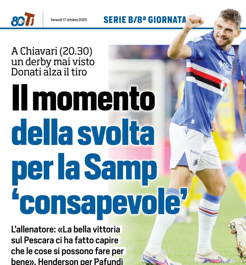 Questa partita – secondo Tuttosport – è anche la cartina tornasole dei “meriti dei chiavaresi” e, soprattutto, delle “disgrazie sportive dei blucerchiati”. Sarà una partita tutt’altro che scontata per la Sampdoria, chiamata al momento della svolta. Attesa anche da Massimo Donati, che ha rifiutato di catalogare la sfida come quella tra Davide e Golia.