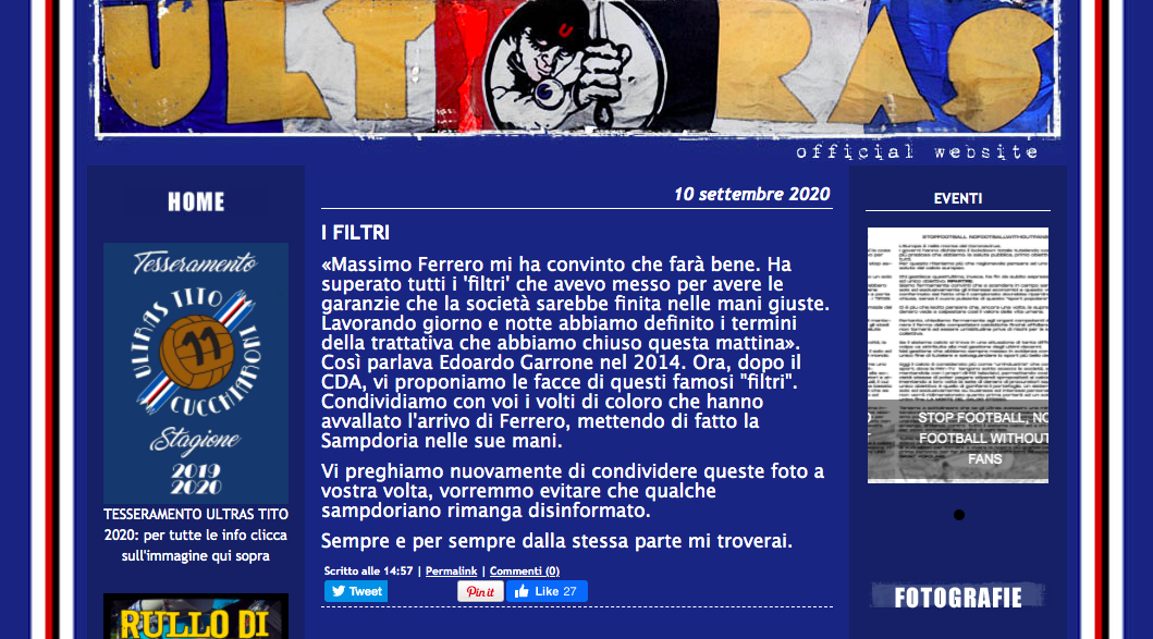 “Massimo Ferrero mi ha convinto che farà bene. Ha superato tutti i ‘filtri’ che avevo messo per avere le garanzie che la società sarebbe finita nelle mani giuste. Lavorando giorno e notte abbiamo definito i termini della trattativa che abbiamo chiuso questa mattina”. “Così parlava Edoardo Garrone nel 2014. Ora, dopo il CDA, vi proponiamo le facce di questi famosi “filtri”. Condividiamo con voi i volti di coloro che hanno avvallato l’arrivo di Ferrero, mettendo di fatto la Sampdoria nelle sue mani”.