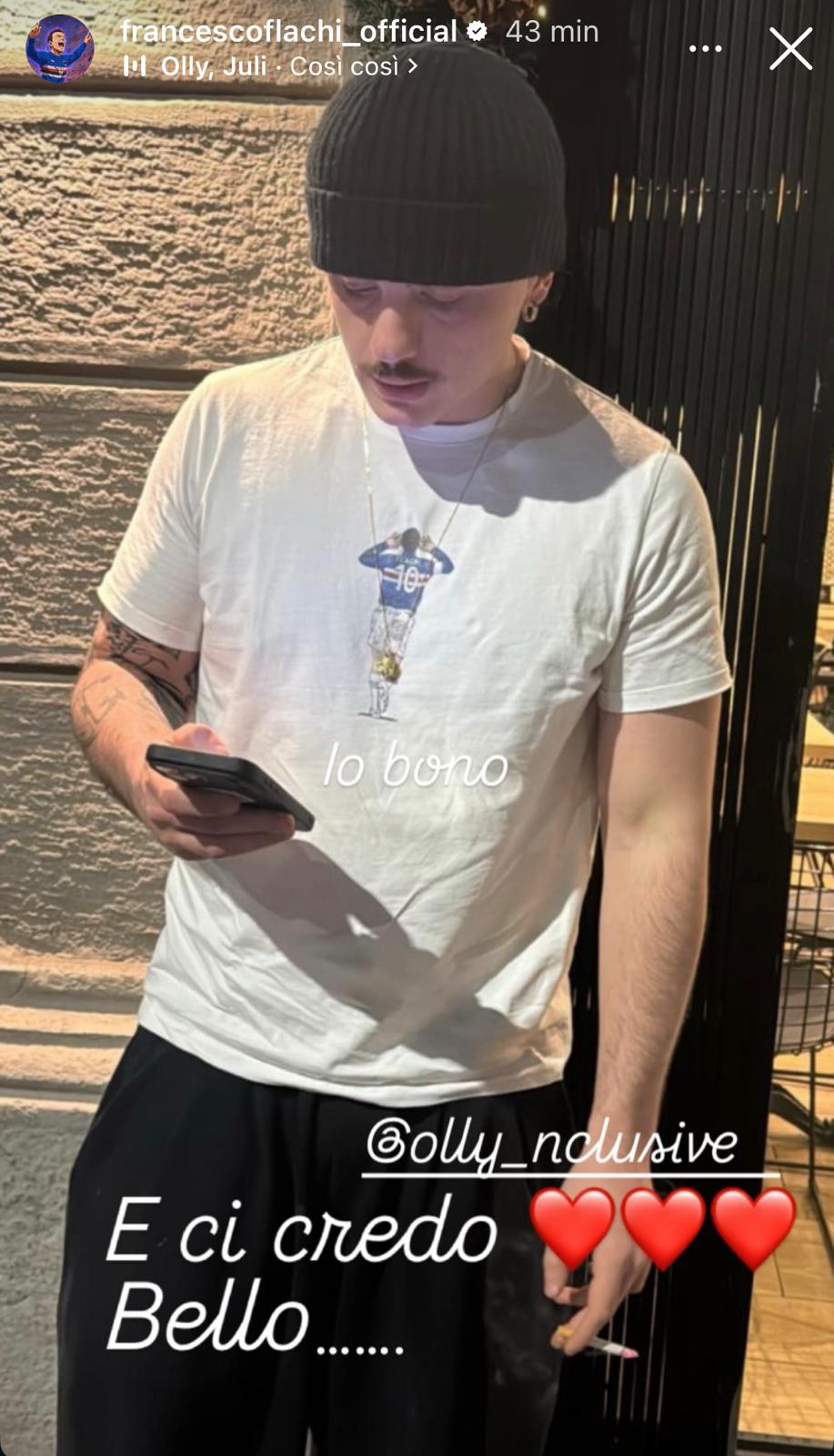 A testimoniarlo è uno scatto che sta facendo sorridere i tifosi della Sampdoria: Olly indossa una maglietta con l’iconica immagine del numero 10 blucerchiato, un chiaro omaggio a Francesco Flachi. Un tributo che non è passato inosservato.