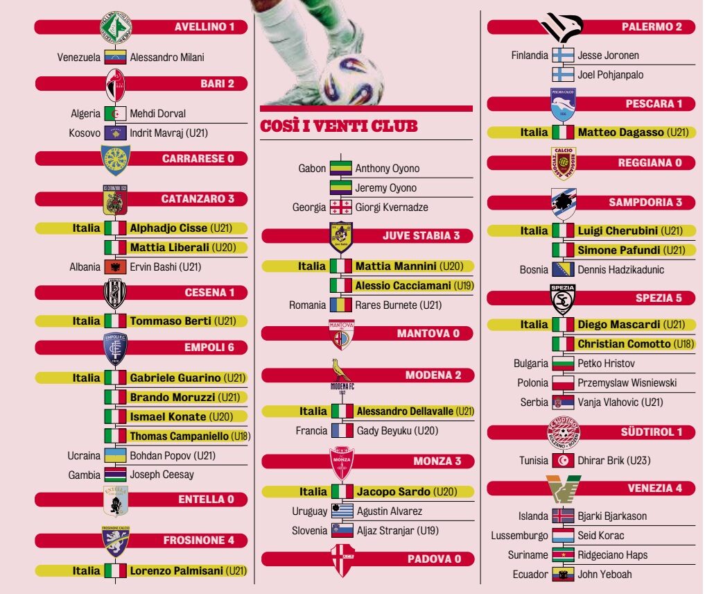Insieme alla Sampdoria, a quota 3, ci sono Catanzaro, Juve Stabia e Monza, mentre a quota 2 Bari, Modena e Palermo. Un solo partente per Avellino, Cesena, Pescara e Sudtirol. Nessuno, inevece, per Carrarese, Entella, Mantova e Reggiana.