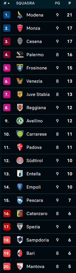La Sampdoria ha giocato contro il Frosinone al Luigi Ferraris, ma la sfida dei blucerchiati non è stata l’unica delle giornata odierna (25 ottobre 2025). Infatti l’Avellino ha ospitato lo Spezia, il Pescara ha fatto visita alla Virtus Entella, il Monza ha giocato in casa contro la Reggiana e il Cesena è partito per Bolzano per giocare al Druso in casa del Sudtirol.