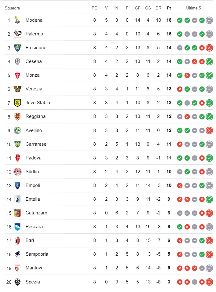 Domenica 1-1 tra Palermo e Modena, con i rosanero che non riescono a superare i gialloblù, che strappano un punto grazie all’autogoal di Bartosz Bereszynski e guidano la classifica con 18 punti. Perde il Catanzaro, che cade in casa contro il Padova, mentre finisce 1-1 la sfida tra Empoli e Venezia.