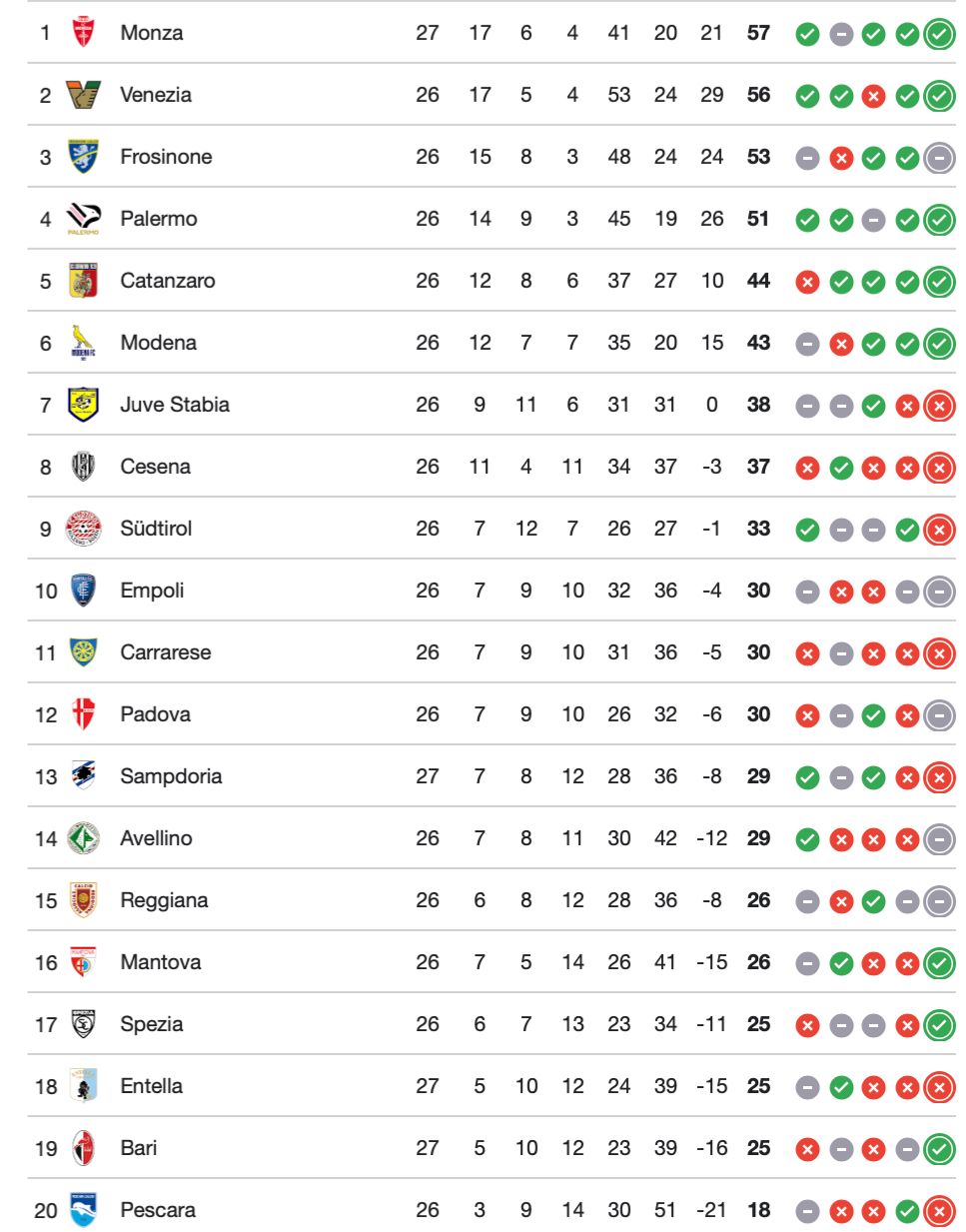 Il ko della Sampdoria riaccende anche le speranze di chi insegue. Reggiana e Mantova, entrambe appaiate a quota 26 punti, vedono ora i blucerchiati (fermi a 29) a una sola lunghezza di distanza. Per gli emiliani e i virgiliani, il prossimo turno rappresenta l’occasione d’oro per tentare un aggancio che fino a poche settimane fa sembrava proibitivo, rimescolando totalmente le carte in una lotta salvezza (e per i play-off) che promette un finale di stagione incandescente.