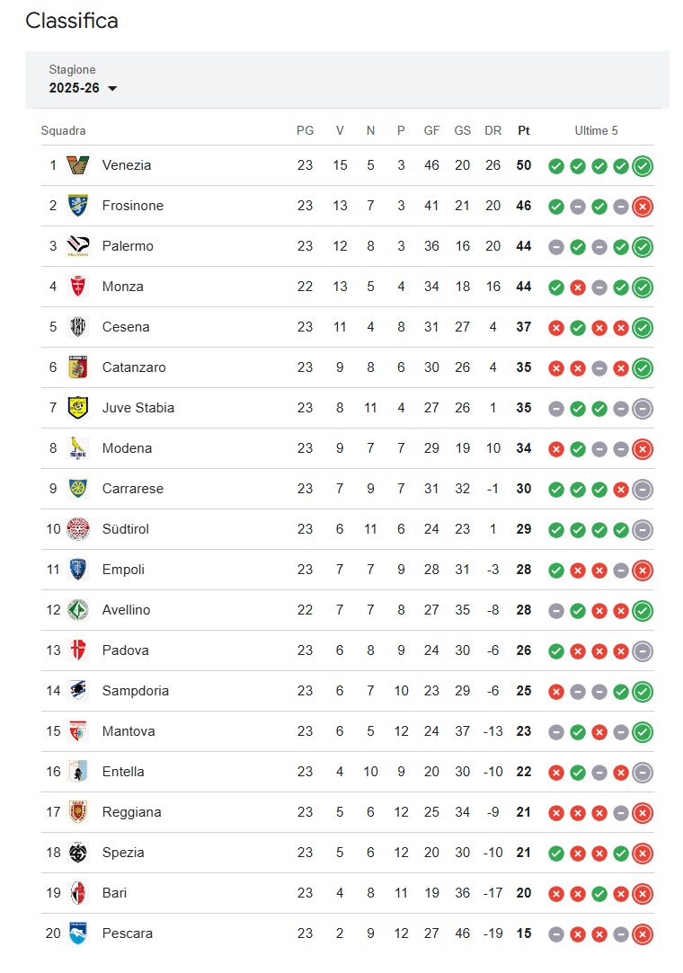 La classifica di Serie Bkt fa felice la Sampdoria, in modo particolare grazie al pareggio tra Spezia e Virtus Entella...