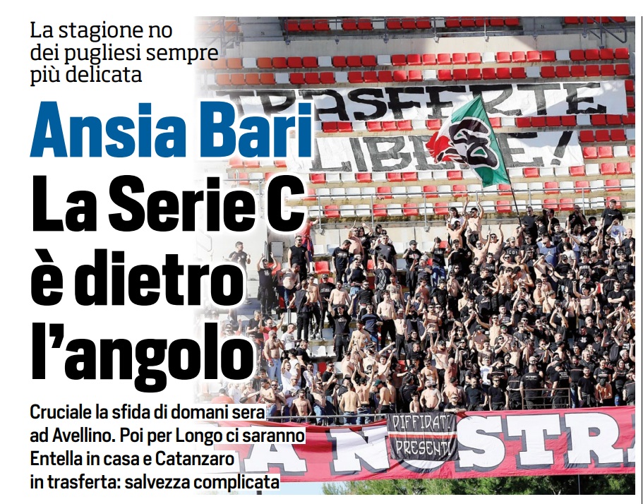 Anzi, secondo Tuttosport, “La Serie C è dietro l’angolo”. La partita di venerdì 24 aprile contro l’Avellino, in trasferta, sarà cruciale per i pugliesi. Gli irpini hanno come obiettivo i playoff e non vogliono lasciare punti, mentre lo Spezia andrà a Catanzaro, il Pescara avrà la Juve Stabia e la Reggiana ospiterà il Palermo.