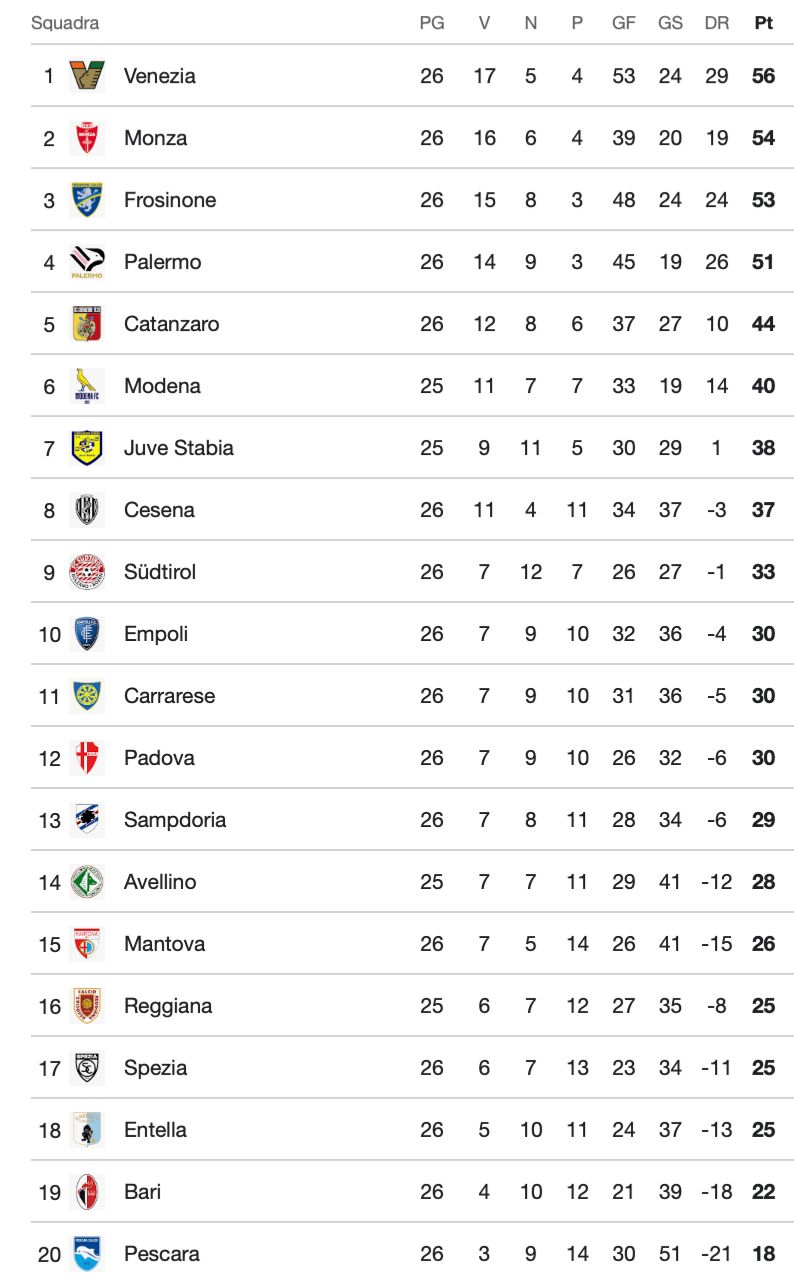 Nelle altre gare di giornata non sono mancate conferme e segnali forti. Il Palermo continua a correre con autorevolezza, imponendosi con decisione e restando agganciato alle posizioni di alta classifica. Successo pesante anche per il Venezia, che sfrutta al meglio il fattore campo e rimane pienamente in corsa per i piani nobili. Vittoria significativa per il Catanzaro, mentre tra Padova e Bari prevale l’equilibrio, con un punto che muove la classifica ma non cambia gli scenari.